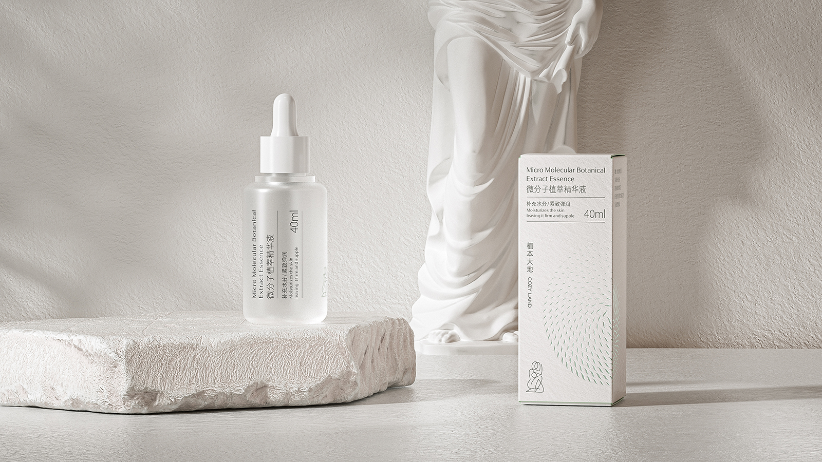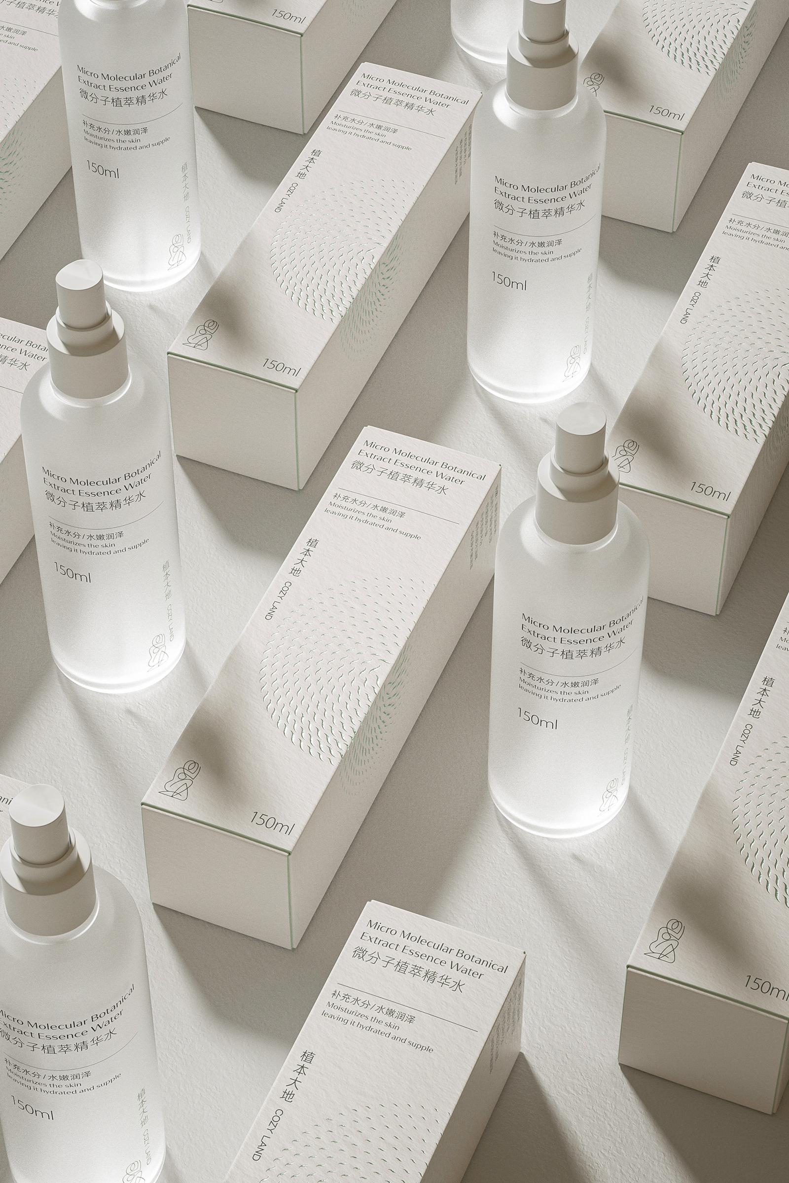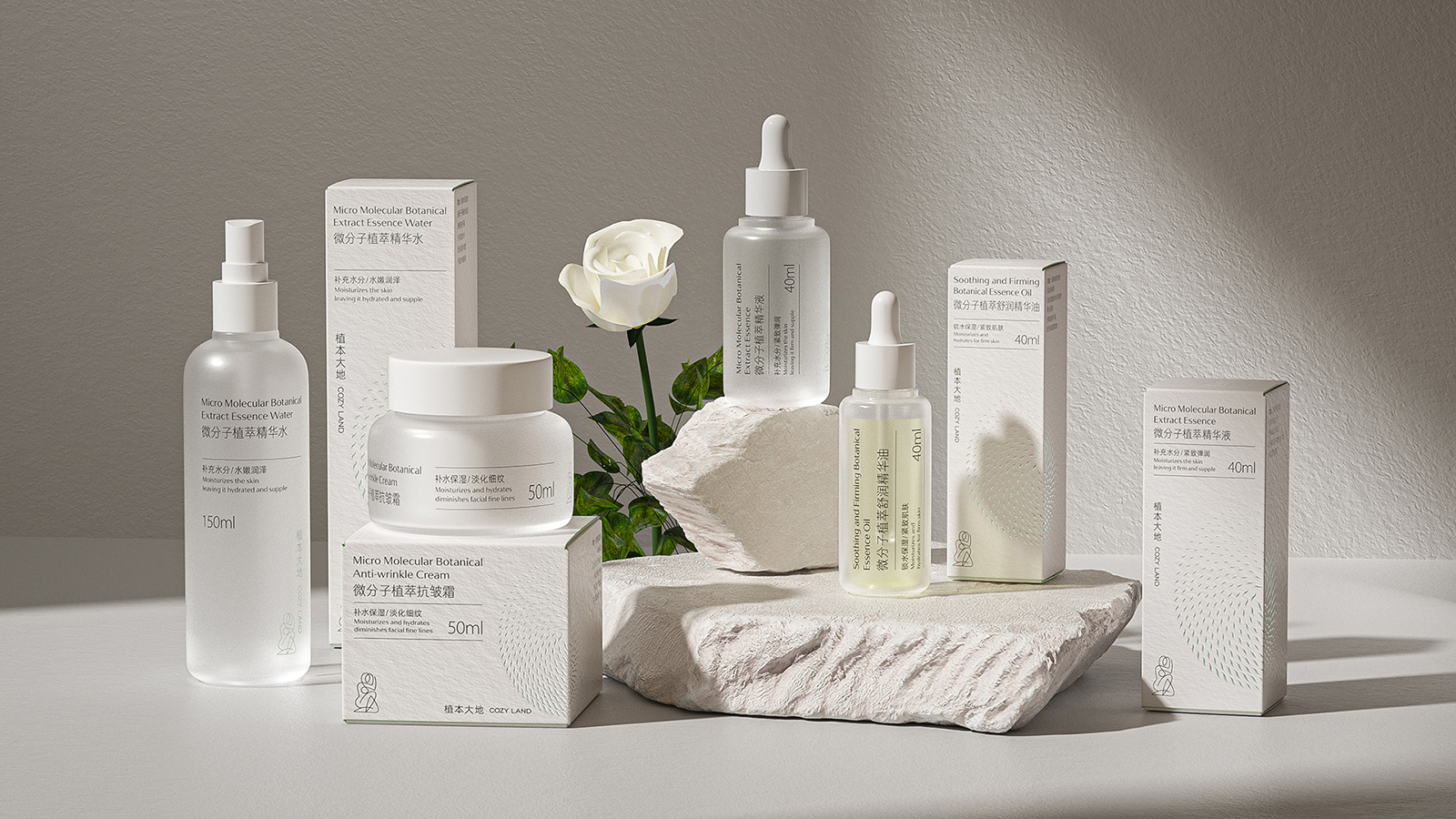 天然植物化妆品的产品包装设计不仅要求自然审美的艺术,更力求传播品牌的和谐价值和护肤特性优势。同时通过设计视觉的理念、风格与消费者进行有效的沟通。天然植物护肤系列包括微分子植萃精华水、抗皱霜、精华油和精华液。整体设计风格简约而优雅,采用了柔和的白色和米色为主色调,给人一种纯净、自然的感觉。这种颜色选择不仅传达了产品的天然成分,也符合现代消费者对简约美学的追求。
