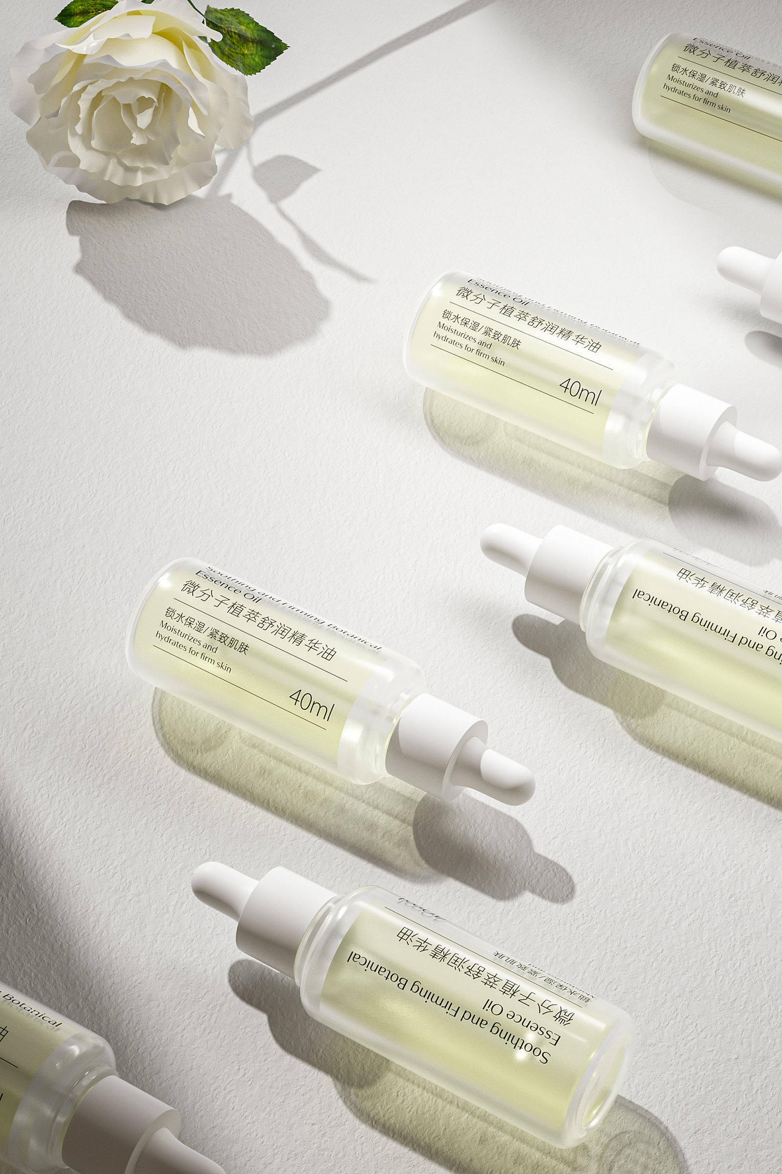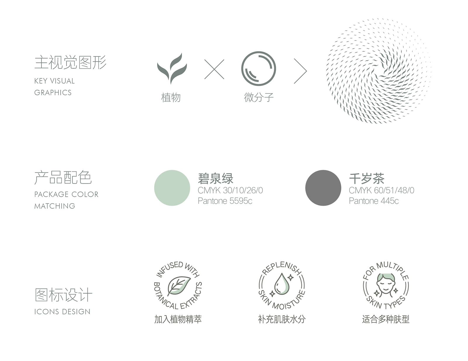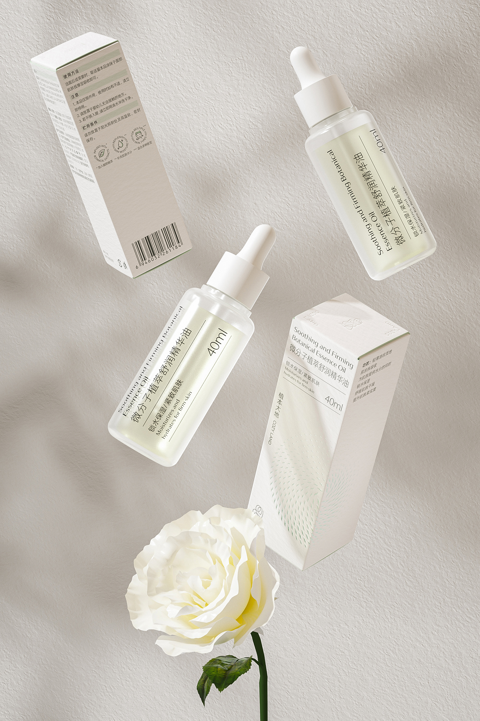 天然植物化妆品的产品包装设计不仅要求自然审美的艺术,更力求传播品牌的和谐价值和护肤特性优势。同时通过设计视觉的理念、风格与消费者进行有效的沟通。天然植物护肤系列包括微分子植萃精华水、抗皱霜、精华油和精华液。整体设计风格简约而优雅,采用了柔和的白色和米色为主色调,给人一种纯净、自然的感觉。这种颜色选择不仅传达了产品的天然成分,也符合现代消费者对简约美学的追求。