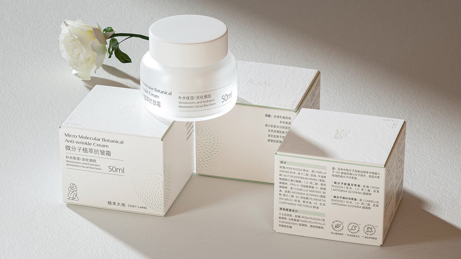 在设计细节上产品包装采用了统一的字体风格,增强了品牌的视觉识别度。包装材质采用了环保材料和表面有细腻的纹理,增加了触感的丰富性的高品质。抗皱霜的包装盒采用了白色为主色调,搭配简洁的字体和线条,给人一种专业和可靠的感觉。包装的图案设计简洁而富有艺术感,瓶身设计独特采用了磨砂质感的材质,增加了产品的高级感。背景采用了柔和的白色和米色,搭配简洁的线条和形状,营造出一种宁静和优雅的氛围。突出了产品的天然和纯净特性相呼应,同时增加了画面的美感,也暗示了产品的天然成分和护肤效果。护肤产品整体包装设计风格简约而优雅,色彩柔和而自然,细节设计精致而富有天然艺术感。通过专业的设计有效的增强了品牌的识别度和高端友好的吸引力。